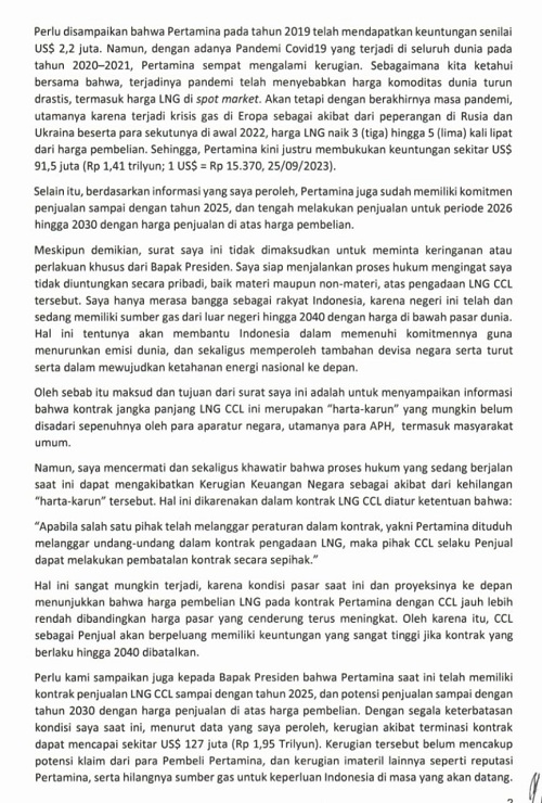 Perlu kami sampaikan juga kepada Bapak Presiden bahwa Pertamina saat ini telah memiliki kontrak penjualan LNG CCL sampai dengan tahun 2025, dan potensi penjualan sampai dengan tahun 2030 dengan harga penjualan di atas harga pembelian. Dengan segala keterbatasan kondisi saya saat ini, menurut data yang saya peroleh, kerugian akibat terminasi kontrak dapat mencapai sekitar US$ 127 juta (Rp 1,95 Trilyun). Kerugian tersebut belum mencakup potensi klaim dari para Pembeli Pertamina, dan kerugian imateril lainnya seperti reputasi Pertamina, serta hilangnya sumber gas untuk keperluan Indonesia di masa yang akan datang.