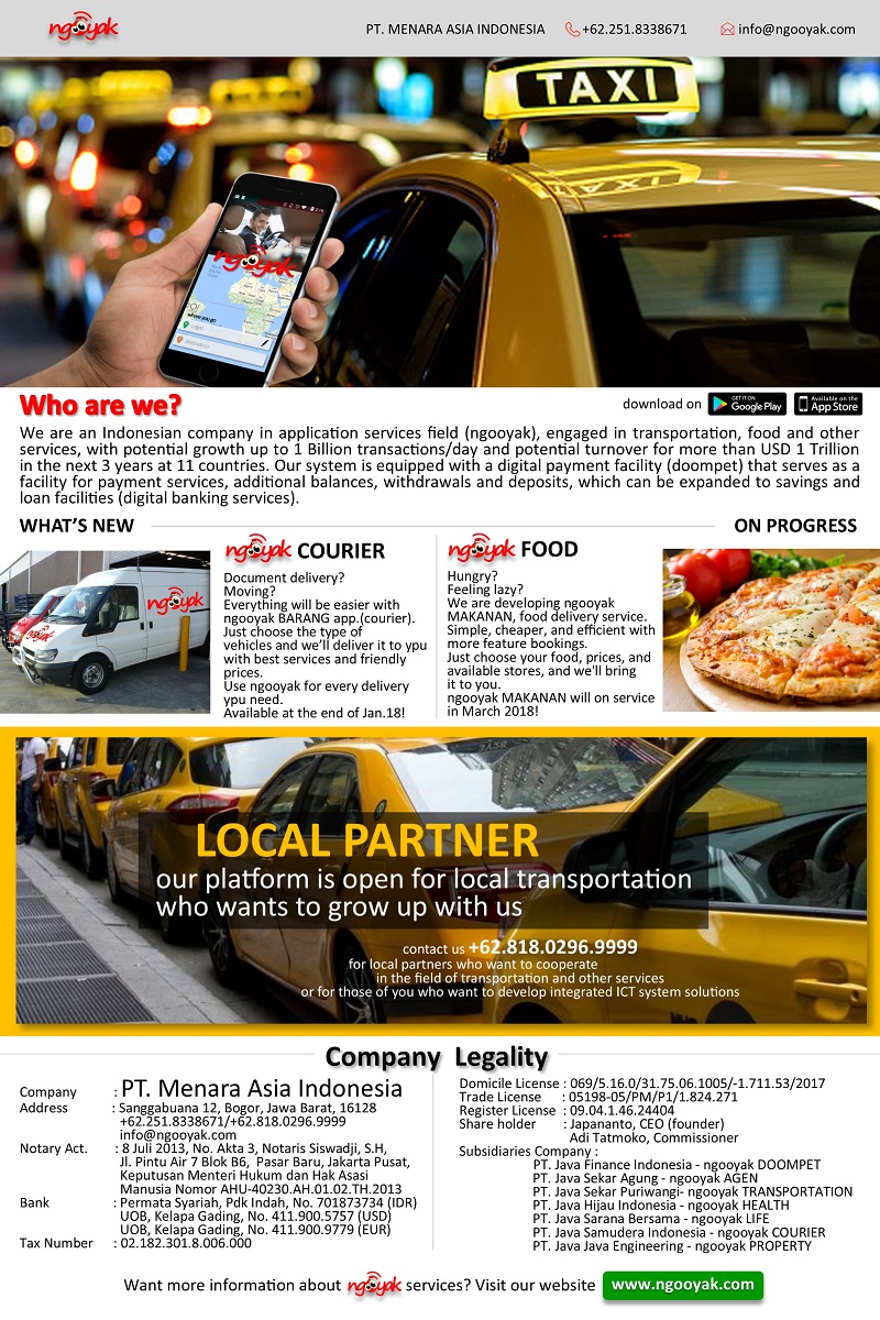 “Bagi anda yang membutuhkan pekerjaan atau sekedar ingin mendapatkan tambahan, bisa bergabung;bersama sebagai Mitra. Dapatkan potensi pendapatan hingga 15 juta per bulan. Apapun jenis kendaraan Anda, mulai dari Mobil, Motor, hingga Bajaj, Becak, Pick up, Truck dan Angkutan Umum, segera daftarkan sesuai dengan jenis kendaraan yang Anda miliki. Hubungi Agen terdekat untuk menjadi Mitra Ngooyak di kota Anda”, ujar Japananta, CEO/Founder Ngooyak.