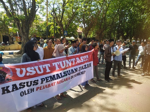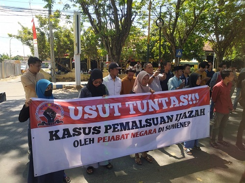 Puluhan massa membentang spanduk bertuliskan “Usut Tunta Kasus Pemalsuan Ijasah oleh Pejabat Negara di Sumenep”. Dalam orasinya merekaa meminta kepada kepolisian untuk tidak pandang bulu dan tidak takut untuk mengusut para pelaku, termasuk para pejabat, yang jelas telah menggunakan ijasah palsu.