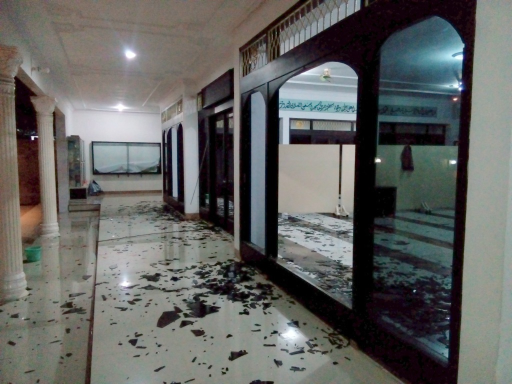 Sekitar pukul 01.30 Wib pelaku melakukan pengrusakan terhadap kaca Masjid Baiturrahim dengan menendang menggunakan kaki.