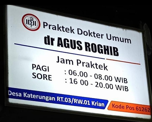 Begitu pula yang dilakukan dr.Agus Roghib dengan membuka praktik mandiri di kampung tempat tinggalnya tanpa dibekali SIP ( Surat Izin Praktik) yang tertera pada papan nama seperti layaknya Dokter umum yang melakukan praktek mandiri.