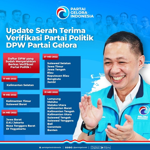 Kepastian ini, disampaikan setelah Dewan Pimpinan Nasional (DPN) Partai Gelora setelah menerima berkas verifikasi parpol dari 25 provinsi atau Dewan Pemimpnan Wilayah (DPW). Pada Selasa (31/5/2022) malam, Partai Gelora menerima tambahan 11 DPW dari sebelumnya 14 DPW.