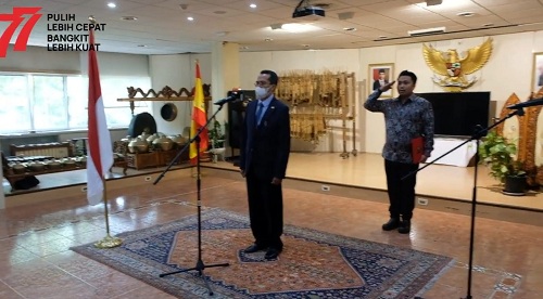 Dubes Muhammad Najib memimpin upacara Pengukuhan Paskibraka yang akan bertugas pada upacara HUT Kemerdekaan RI ke-77 tanggal 17 Agustus 2022.