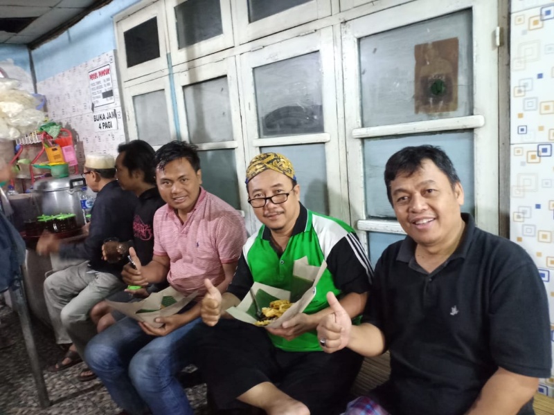 Qomarrudin Co-founder KAHMIPreneur (tengah pakai blangkon) menikmati makan nasi pecel setelah Workshop di Jember