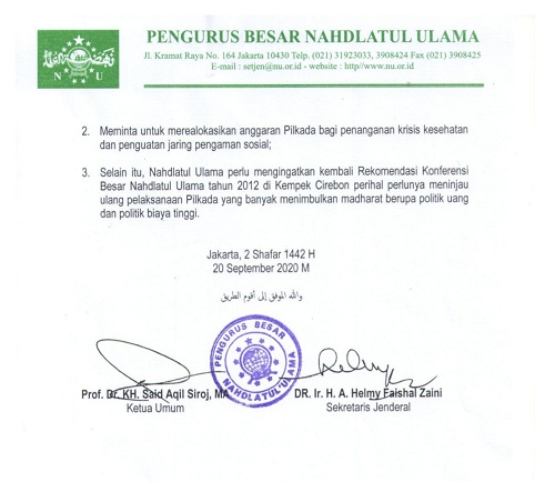 Terakhir dalam suratnya PBNU meminta agar meninjau ulang pelaksanaan Pilkada yang banyak menimbulkan mudharat berupa politik uang dan politik biaya tinggi.