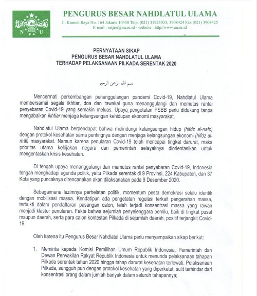 PBNU juga meminta agar anggaran Pilkada dialokasikan untuk penanganan krisis kesehatan dan penguatan jaring pengaman sosial.