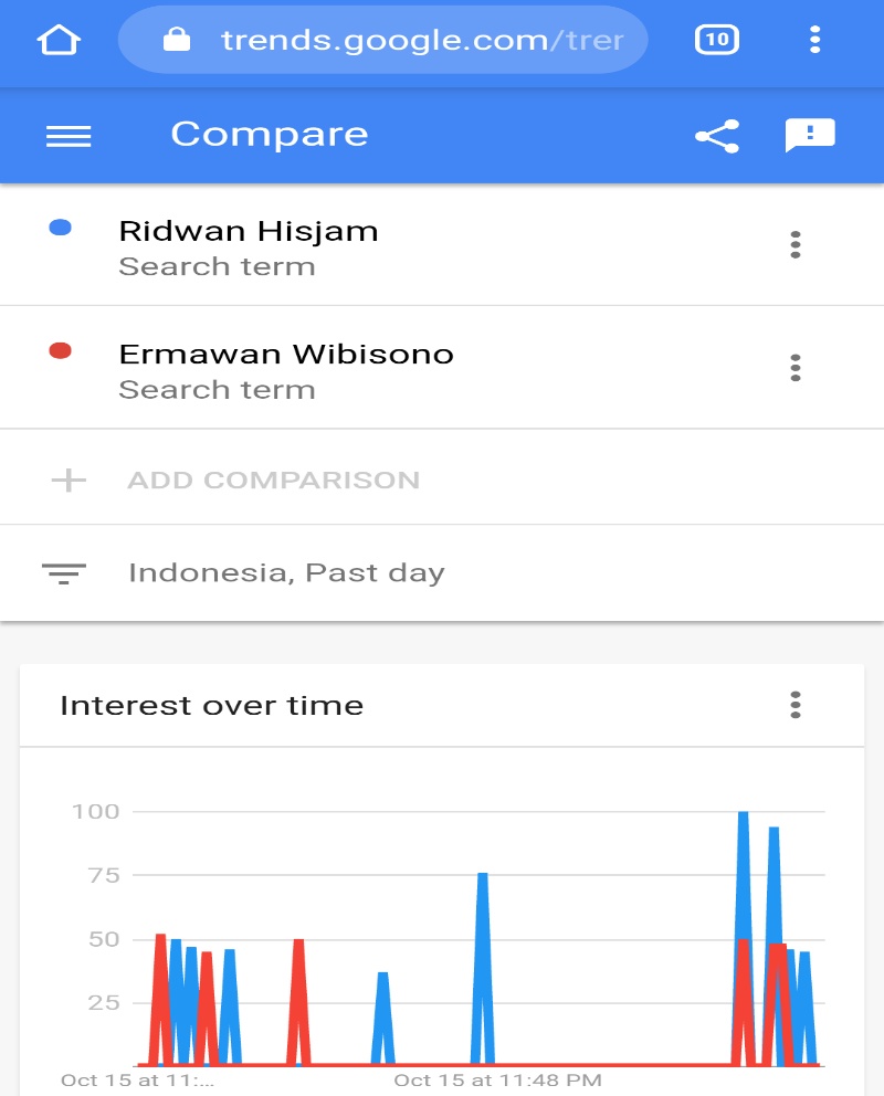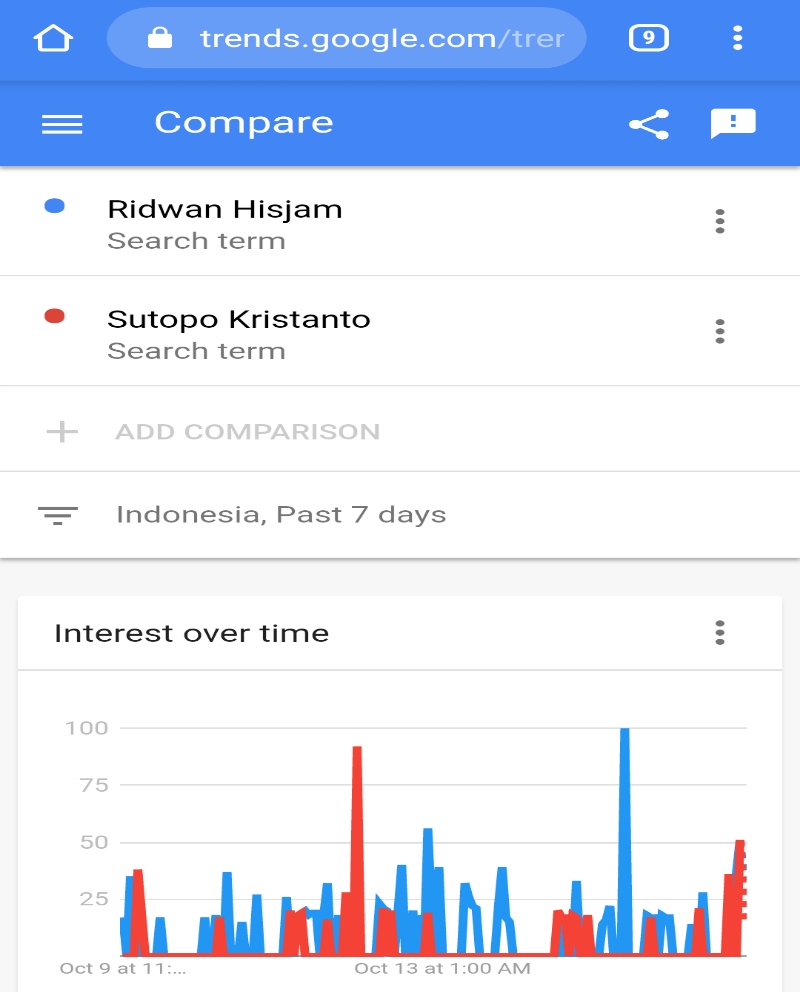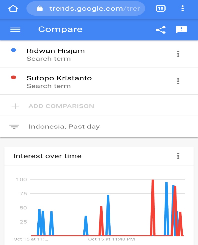 Berdasarkan penelusuran tim zonasatunews.com dengan menggunakan aplikasi google trend, Ridwan Hisjam masih paling populer. Bersaing ketat dengan Sutopo Kristanto.