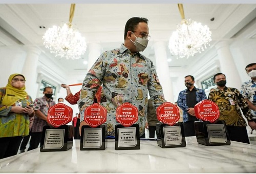 ZONASATUNEWS.COM, JAKARTA -Pemprov DKI Jakarta memenangkan penghargaan untuk lima kategori, yakni Top Digital Implementation 2021 Level Stars 5 untuk Pemprov DKI; Top Leader on Digital Implementation 2021 untuk Gubernur Provinsi DKI Jakarta, Anies Baswedan; Top CIO on Digital Implementation 2021 untuk Kepala Dinas Komunikasi, Informatika dan Statistik Provinsi DKI Jakarta, Atika Nur Rahmania; Top Digital in Public Service & Smartcity Solution 2021 untuk Pemprov DKI; dan Top IT Manager on Digital Implementation 2021 untuk Kepala BLUD Jakarta Smart City, Yudhistira Nugraha.