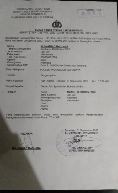 Setelah peristiwa tersebut, para korban lantas menuju Polsek Wonocolo untuk membuat pelaporan kejadian Penganiyaan yang dilakukan oknum panitia Pbak Uinsa.