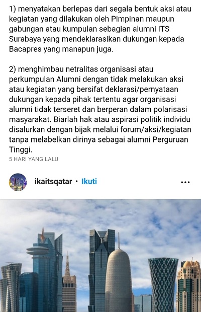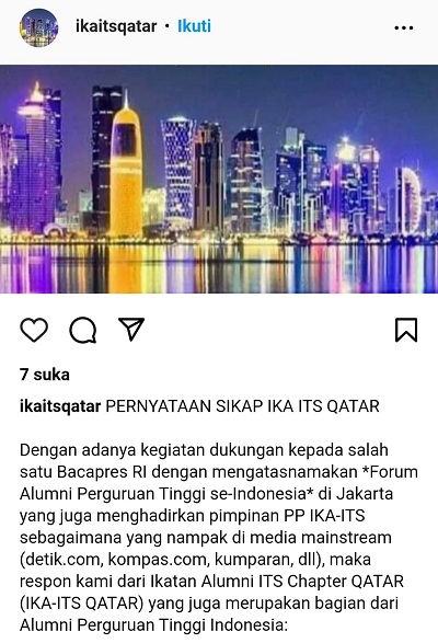 Melalui akun Instagram IKA ITS Qatar menyatakan, dengan adanya kegiatan dukungan kepada salah satu Bacapres RI dengan mengatasnamakan Forum Alumni Perguruan Tinggi se-Indonesia di Jakarta yang juga menghadirkan pimpinan PP IKA-ITS sebagaimana yang nampak di media mainstream (detik.com, kompas.com, kumparan, dll), maka respon kami dari Ikatan Alumni ITS Chapter QATAR (IKA-ITS QATAR) yang juga merupakan bagian dari Alumni Perguruan Tinggi Indonesia: