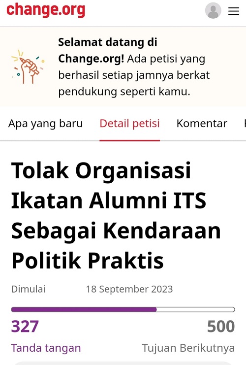 ZONASATUNEWS.COM, JAKARTA – Penolakan pernyataan dukungan secara langsung dan terbuka Ketua Umum IKA ITS Sutopo Kristanto kepada Capres Ganjar Pranowo di The Ballroom Djakarta Theater, Jakarta Pusat, Minggu (17/9/2023), maki meluas. Setelah sebelumnya beberapa alumni senior menilai sebagai tidak etis, kemudian disusul ratusan alumni membuat Petisi penolakan. Sebanyak 325 orang memberi tanda tangan dalam Petisi tersebut.
