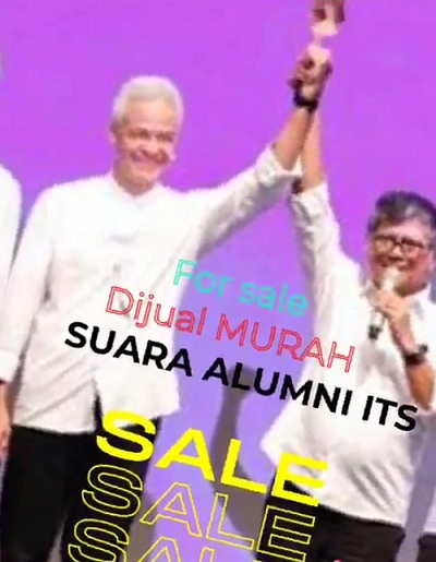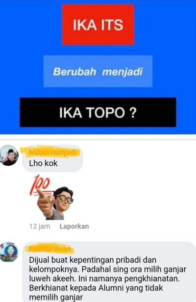 “IKA ITS berubah menjadi IKA TOPO. Dijual buat kepentingan pribadi dan kelompoknya. Padahal sing ora milih Ganjar luwih akeeh. Ini namanya pengkhianatan. Berkhianat kepada alumni yang tidak memilih Ganjar,” tulis seorang alumni ITS dalam sebuah akun medsos.