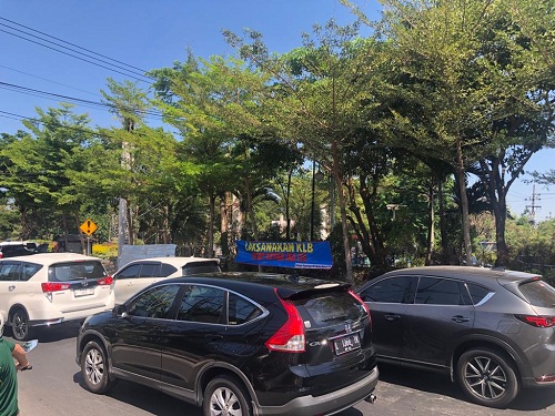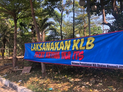 Beberapa spanduk dan flyer beruliskan: “Jangan Jual IKA ITS Seharga Nasi Bungkus”, “Laksanakan KLB, Pecat Ketua IKA ITS”, “For Sale, dijual Murah Suara ALumni ITS, Sale”, ” IKA ITS Berubah Menjadi IKA TOPO”.