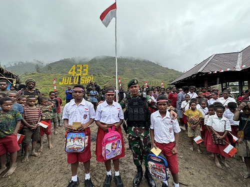 Panitia Yonif Satgas Yonif Para Raider 433/JS Pos Mbua memberikan hadiah berupa alat tulis dan tas sekolah