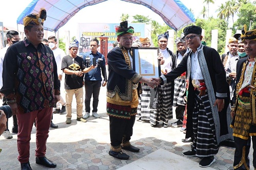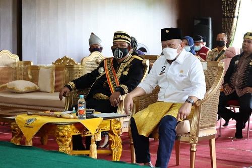 KETERANGAN FOTO :Ketua DPD RI diberi gelar kekerabatan bergelar Pangeran Jaya Sukma Dilaga di sela-sela kunjungan kerjanya ke Kalimantan Barat. Prosesi penyematan dilakukan di Balai Rung Sari Keraton Kusuma Negara Sekadau, Jumat (29/10/2021).