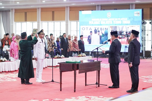 Pelantikan Pj Wali Kota Tebingtinggi berlangsung di aula Tengku Rizal Nurdin, di Jalan Jenderal Sudirman, Kec Medan Polonia, Kota Medan, Selasa(28/5).