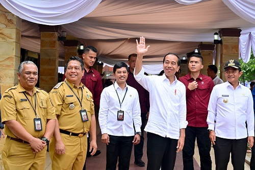 Setelah usai melakukan peninjauan RSUD dr. H. Kumpulan Pane, Presiden RI didampingi Wakil Menteri Kesehatan Dante Saksono Harbuwono, Anggota DPR RI Meutya Hafid, Direktur Utama BPJS Kesehatan Prof. Dr. Ali Ghufron Mukti, M.Sc., Ph.D., AAK, Pj. Gubernur Sumatera Utara Hassanudin dan Pj. Wali Kota Tebing Tinggi, Drs. Syarmadani, M.Si melakukan silahturahmi dengan peserta JKN-KIS di Gor Asber Nasution Kota Tebing Tinggi.
