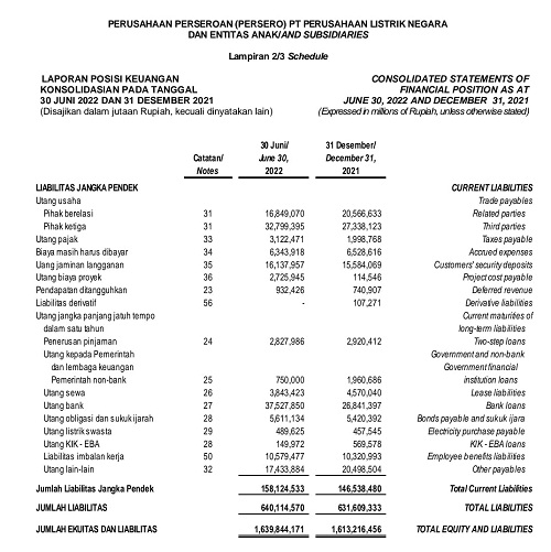 Utang PLN dalam laporan keuangan semester I tahun 2022 mencapai Rp. 640,15 triliun, naik dari Rp. 631,51 triliun dari periode yang sama tahun lalu. Rupanya dalam laporan keuangan tahunan tahun 2021 dikatakan utang turun hanya untuk menunjukkan keberhasilan PLN menurunkan utang, setelah itu nambah lagi.