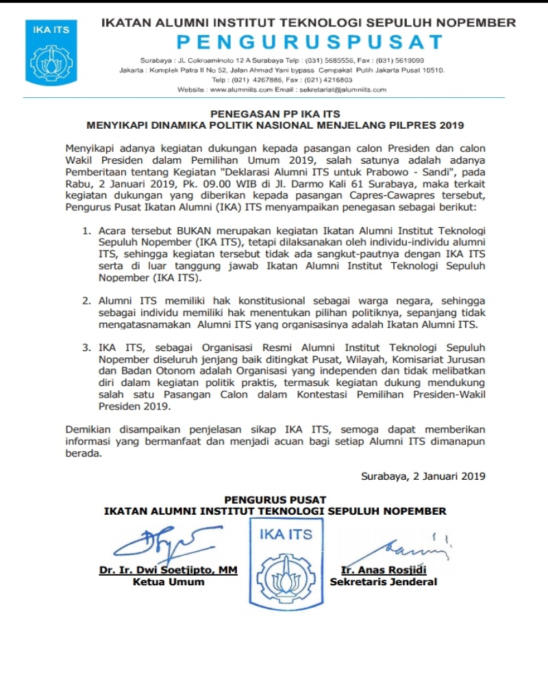 Ada 3 point penegasan dalam surat tersebut. Pertama kegiatan deklarasi tersebut bukan atas nama IKA ITS, tetapi dilaksanakan oleh individu alumni ITS.
