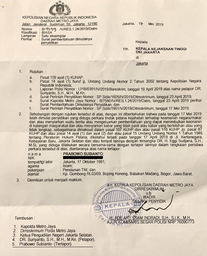 Dalam salinan Surat Perintah Dimulainya Penyidikan (SPDP), laporan dugaan makar yang dituduhkan kepada Prabowo dibuat pada 19 April lalu. Lantas, penyidik Polda Metro Jaya menerbitkan SPDP pada 17 Mei.