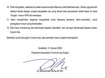 ZONASATUNEWS.COM, SURAKARTA — Dukungan untuk Ubaedilah Badrun terus mengalir dari berbagai lapisan masyarakat. Kali ini dukungan diperoleh dari Presiden Asosiasi Ahli Hukum Pidana atau Association Criminal Law Expert (ACLE), Dr Muhammad Taufiq,SH,MH.