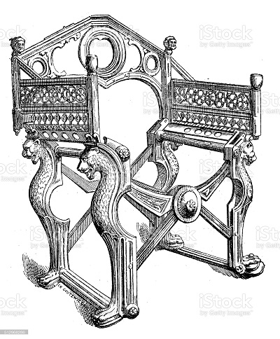 Ilustrasi kursi kayu milik raja Frank Dragobert, yang memerintah Prancis selama periode abad pertengahan.