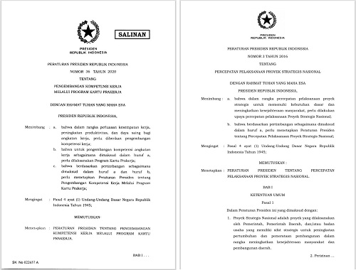 1. Peraturan Presiden No 36 Tahun 2020 (Perpres 36/2020) tentang Pengembangan Kompetensi Kerja Melalui Program Kartu Prakerja.