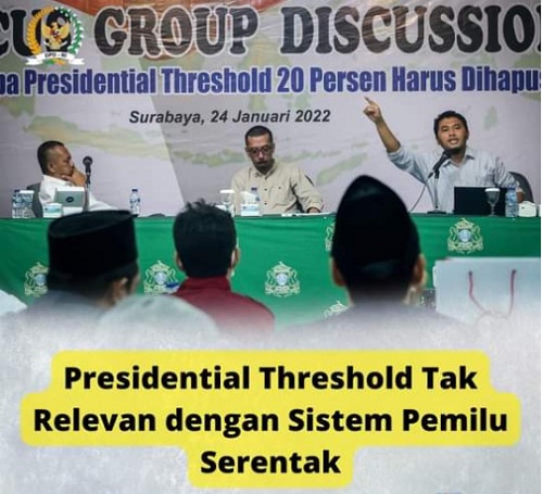 ZONASATUNEWS.COM, SURABAYA – Presidential Threshold 20 persen yang diterapkan Indonesia saat ini, dinilai tidak relevan dengan pelaksanaan Pemilu serentak. Selain itu, Presidential Threshold membuat sistem Presidensial menjadi tidak sehat.