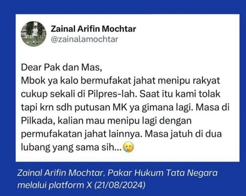 Akbar Faizal menulis, “Yth Pimpinan dan terkhusus Baleg @DPR RI, kami dengar kalian sdg inisiasi keputusan politik melawan putusan MK No.60 ttg trenshold Pilkada. Jika itu benar, sy minta segera hentikan. Buka jendela kantor kalian & lihat rasa gusar rakyat makin memuncak. Jgn menantang kesabaran kami.”
