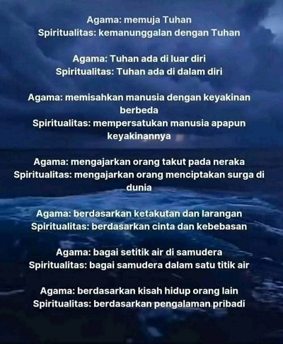Diskusi seputar spiritualitas berlangsung di salah satu grup WA. Hal itu bermula dari unggahan meme salah seorang anggotanya yang mengkontraskan agama dengan spiritualitas sebagai berikut.