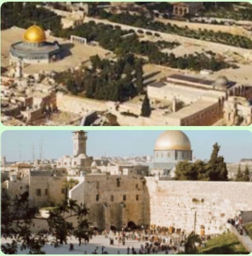 Foto bawah: Tembok Ratapan kaum Yahudi. Foto atas: Foto atas, di depan Masjid Kubah Emas terdapat Masjid Qibli atau Masjid Al – Aqsha, berkubah perak ke abu-abuan