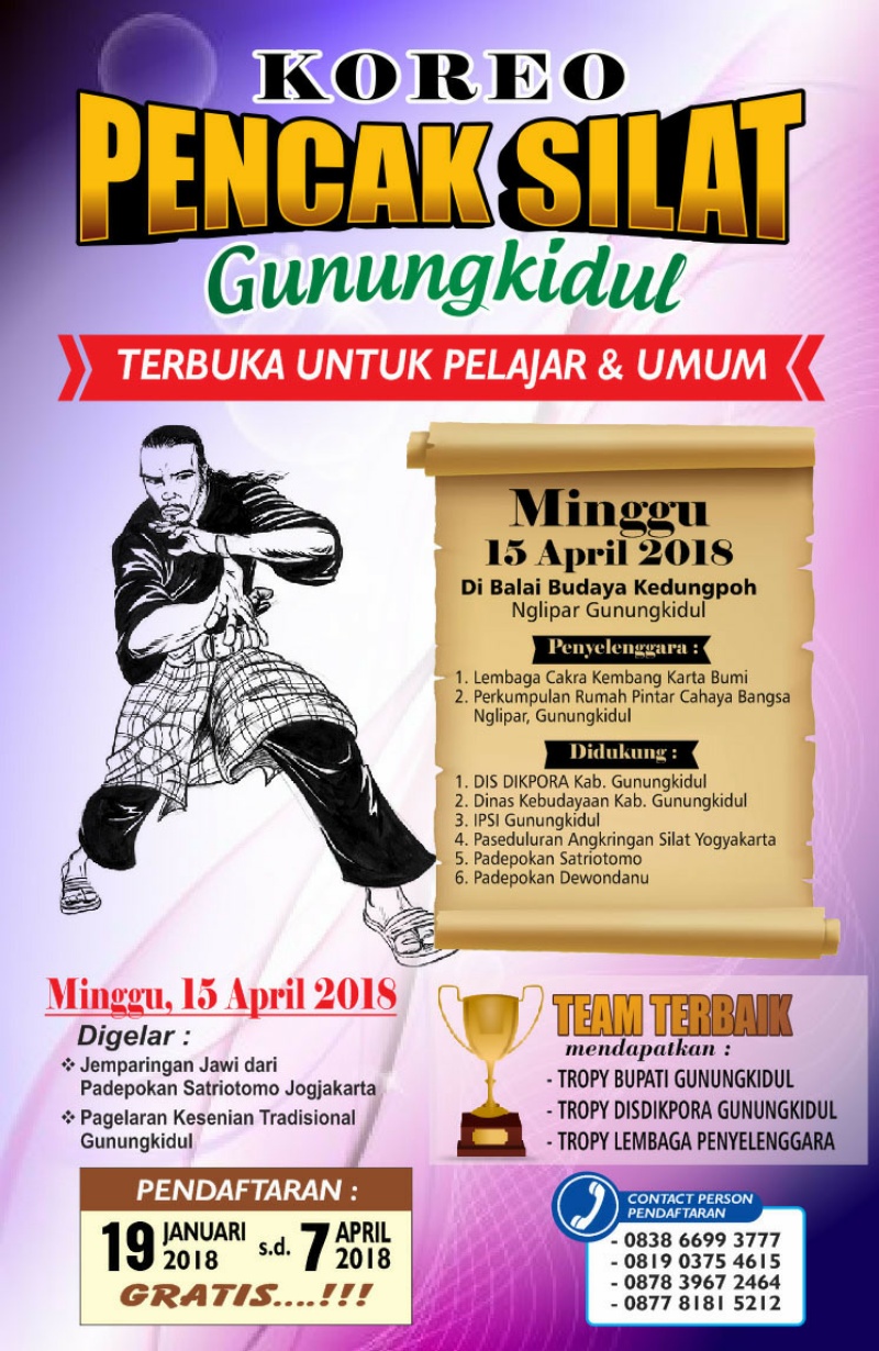 Ajang koreo pencak silat Gunungkidul, selain melibatkan para pendekar dari berbagai perguruan di Gunungkidul, pihak penyelenggara juga mengundang para pelaku silat dari Jogyakarta dan Jawa Tengah, yang tergabung dalam Paseduluran Angkringan Silat Yogyakarta.(beng).
