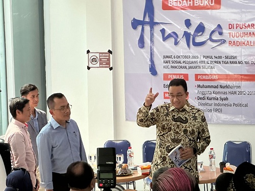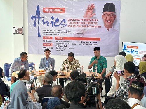 Hadir sebagai pembicara adalah penulis buku Edi Sasmito dan dua pembahas yaitu mantan anggota Komnas HAM M Nur Khoiron dan Jubir tim Anies, Billy David.