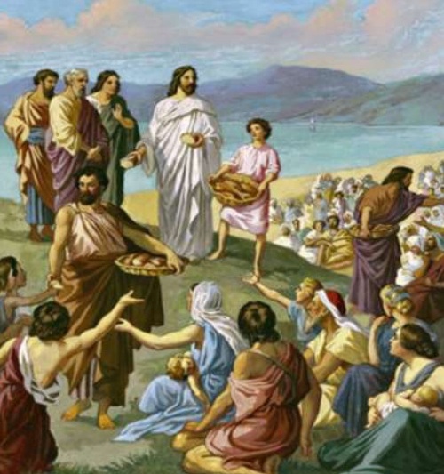 Sangsabda.wordpress.com Lukisan nabi ‘Iysaa memberi makanan pada 5000 orang hanya dari 5 potong roti dan 2 ikan, namun mencukupi.