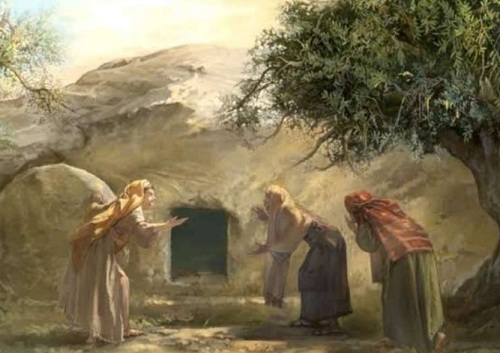 e – Reformed – SABDA. org lukisan tiga Wanita melihat mayat sosok Yesus hilang dari gua tempat ditaruhnya mayat pada hari sebelumnya.