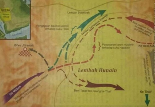 Dalam perang Hunain ini, turun wahyu sebagaima Qs at_taubah 25 -26, yang menjelaskan bahwa ketika kaum muslim menjadi sombong karena jumlah pasukan yang besar, sedang sebelumnya pasukan muslim sangat sedikit dibanding musuhnya, namun ternyata jumlah besar tersebut oleh Allah dibuat menjadi tidak berarti sehingga mengalami kekalahan dan kemudian Allah menolong dengan balatentara-Nya yang tidak nampak (malaikat).