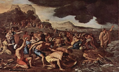 Nicolas Poussin, The crossing of the red sea, National Gallery of Victoria,Melbourne, Australia. Lukisan Nabi Musa dan bani Israel di tepi laut merah. BaniIsrael gelisah dan panik menunggu apa yang akan dilakukan ketika melihat tentaraMeremptah mulai nampak, sedang jalan didepannya terhalang laut.