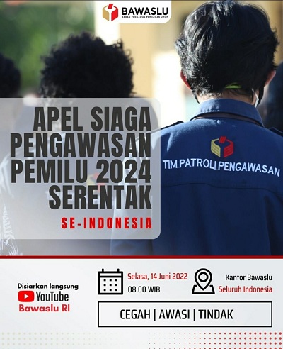 Apel Siaga Pengawasan Pemilu 2024 yang digelar Bawaslu RI se Indonesia secara daring tersebut dipimpin langsung oleh Ketua Bawaslu RI Rahmat Bagja dan diikuti oleh Bawaslu Provinsi dan Bawaslu Kabupaten Kota secara serentak se Indonesia termasuk Bawaslu Kabupaten Ngawi Jawa Timur.