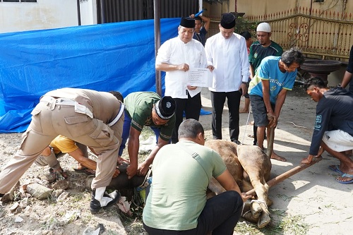 Setelah mengikuti shalat Idul Adha, Pj. Wali Kota bersama Pj. Sekdako dan Asisten Administrasi Pemerintahan dan Kesra mengikuti penyembelihan hewan kurban sebanyak 3 ekor sapi di halaman parkir Balai Kota.