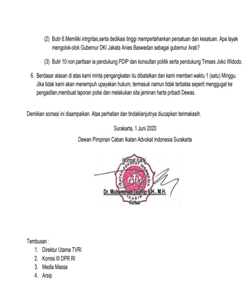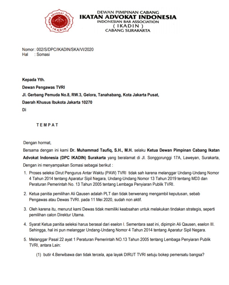 Terkait hal itu Dewan Pimpinan Cabang Ikatan Advokat Indonesia (DPC IKADIN) Surakarta melayangkan somasi kepada Dewan Pengawas TVRI. Surat Somasi dengan Nomor: 002/S/DPC/IKADIN/SKA/VI/2020, dilayangkan hari ini, Senin (1/6/2020).