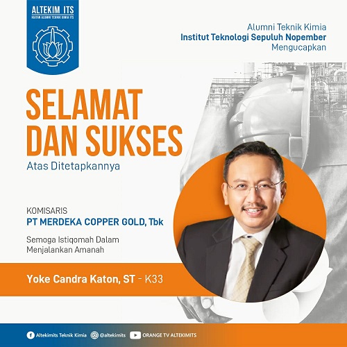 Keluarga Besar Alumni Teknik Kimia ITS mengucapkan Selamat & Sukses atas ditetapkannya YOKE CANDRA KATON (K33) sebagai KOMISARIS PT MERDEKA COPPER GOLD TBK. Semoga bisa melaksanakan amanah yang diberikan dengan baik & benar.