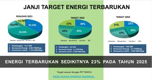 Indonesia telah menetapkan Kebijakan Energi nasional dalam memanfaatkan EBT. Pada tahun 2025 penggunaan EBT harus mencapai minimal 23% dari yang sekarang baru 11,7%. Pada tahun 2050 EBT ditargetkan mencapai 31%.