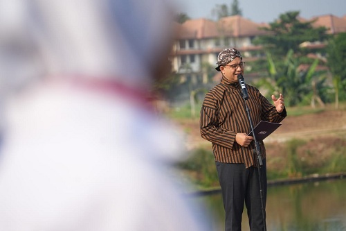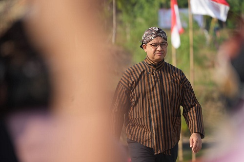 Anies Baswedan mengikuti upacara HUT ke-78 RI di dekat rumahnya, Waduk Lebak Bulus. Anies mengenakan baju kain lurik khas Yogyakarta dan dilengkapi dengan blangkon.