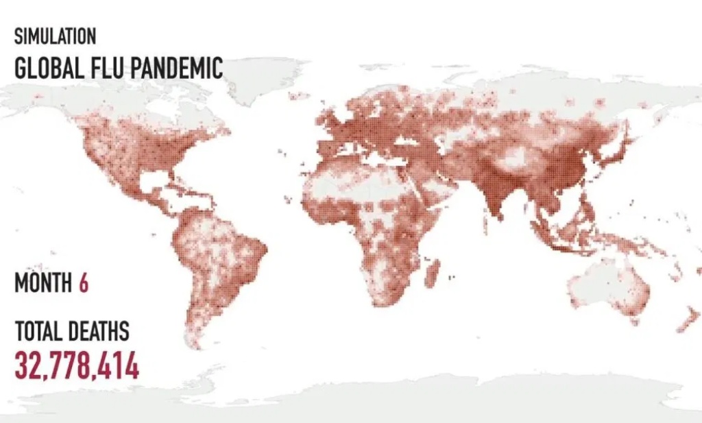 Sebuah pandemi disimulasikan yang menunjukkan seberapa cepat suatu penyakit dapat menyebar dalam 6 bulan