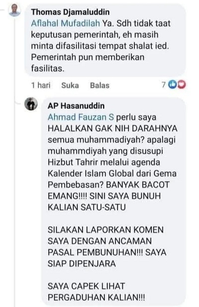“Perlu saya halalkan gak neh darahnya semua Muhammadiyah? apalagi Muhammadiyah yang disusupi Hizbut Tahrir melalui agenda Kalender Islam Global dari Gema Pembebasan? banyak bacot emang, sini saya bunuh kalian satu-satu. Silahkan laporkan komen saya dengan ancaman pasal pembunuhan saya siap dipenjara. Saya capek liat pengaduhan kalian,” tulis AP Hasanuddin.
