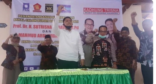 Sedangakan pasangan yang diberangkatkan dari partai gabungan PAN,Demokrat, Gerindra, dan PKS Prof. Dr. Sutrisna Wibawa M.Pd-Mahmud Ardi Widanto,S.IP memilih mendaftar pada hari jumat 5/9 pukul 09.54 Wib.