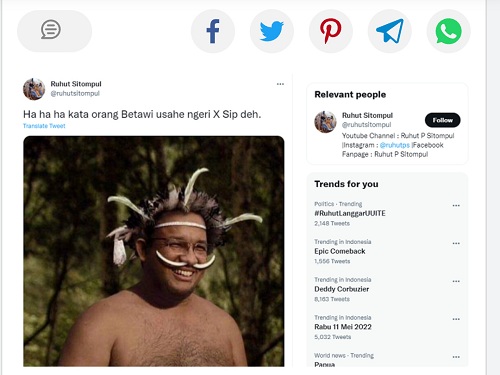 Melalui akun Twitter pribadinya, Ruhut Sitompul mengunggah foto editan Gubernur DKI Jakarta, Anies Baswedan mengenakan koteka. “Ha ha ha kata orang Betawi usahe ngeri X Sip deh,” tulis Ruhut Sitompul melalui akun Twitter pribadinya.