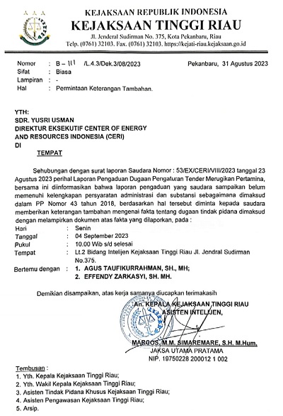 Masih terkait dugaan praktek kartel itu, sebelumnya pada 11 Oktober 2023, Direktur Eksekutif CERI telah diundang klarifikasi oleh BPK RI di kantornya. Bahkan pada 5 September 2023, Direktur CERI telah diundang juga oleh Kejati Riau terkait persoalan proses tender di PT Pertamina Hulu Rokan.
