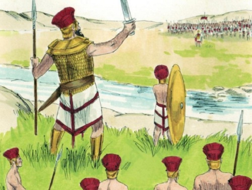 Alkitab SABDA, suku Filistin yang posisinya dipisah dengan sungai,menawarkan adu jago satu lawan satu untuk menyelesaikan pertempurandengan bani Israel.