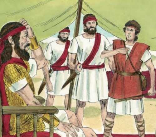 Kitab 1 Samuel 17 menuliskan, secara tak terduga Dawud yang selama itu lebih dikenal sebagai penghibur raja dikala gundah, tiba tiba berkata: “ siapakah orang Filistin yang tak bersunat ini, sampai ia berani mencemoohkan barisan Allah yang hidup?”. Dengan cepat perkataan Dawud menyebar ke seluruh pasukan sehingga kakak Dawud yaitu Eliab juga mendengar perkataannya, yang kemudian menegurnya. Eliab mengetahui bahwa adik bungsunya itu pemberani dan khawatir adiknya akan maju melawan Jalut. Perkataan Dawud akhirnya juga didengar oleh Saul, dan kemudian menyuruh memanggil Dawud. Saul berkata: “ tidak mungkin engkau dapat menghadapi orang Filistin itu dan melawan dia, sebab engkau masih muda, sedang dia sejak dari masa mudanya telah menjadi prajurit “.